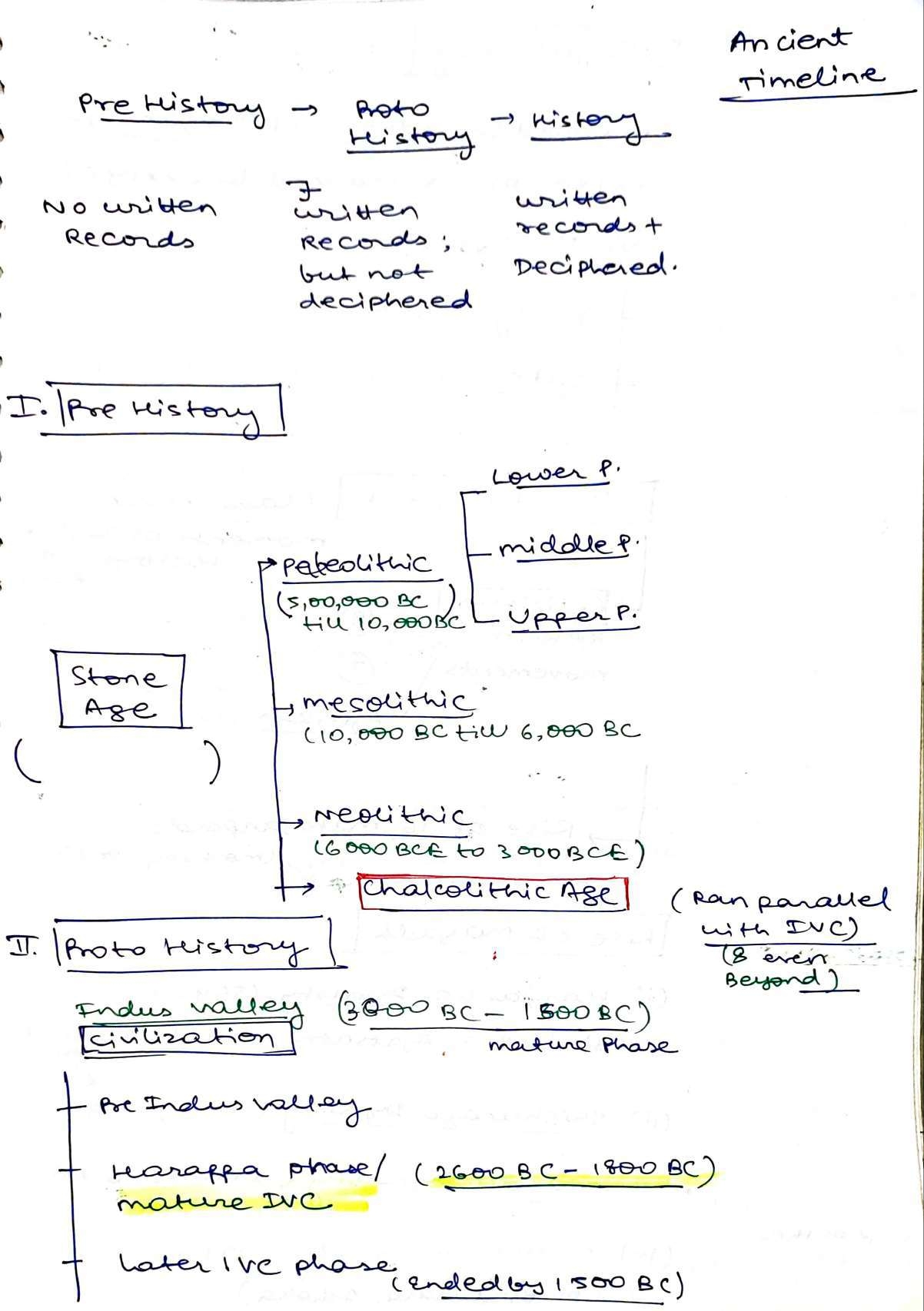 The notes begin with pre-history, explaining how historians classify human development into Paleolithic, Mesolithic, and Neolithic phases. Clear differentiation between hunting-gathering societies and early agricultural settlements is provided. This foundation is important because many UPSC questions test conceptual clarity about social and technological transitions.